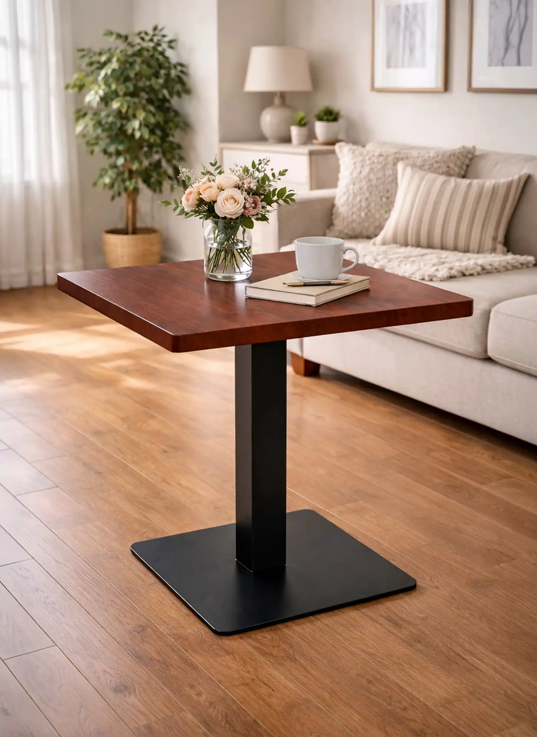 - Diseño con pie central de hierro. A diferencia de mesas con patas tradicionales, el pie central robusto en hierro lacado negro maximiza el espacio para las piernas, facilitando el movimiento de sillas y evitando tropiezos. Es una ventaja práctica tanto en hogares como en restaurantes o cafés.