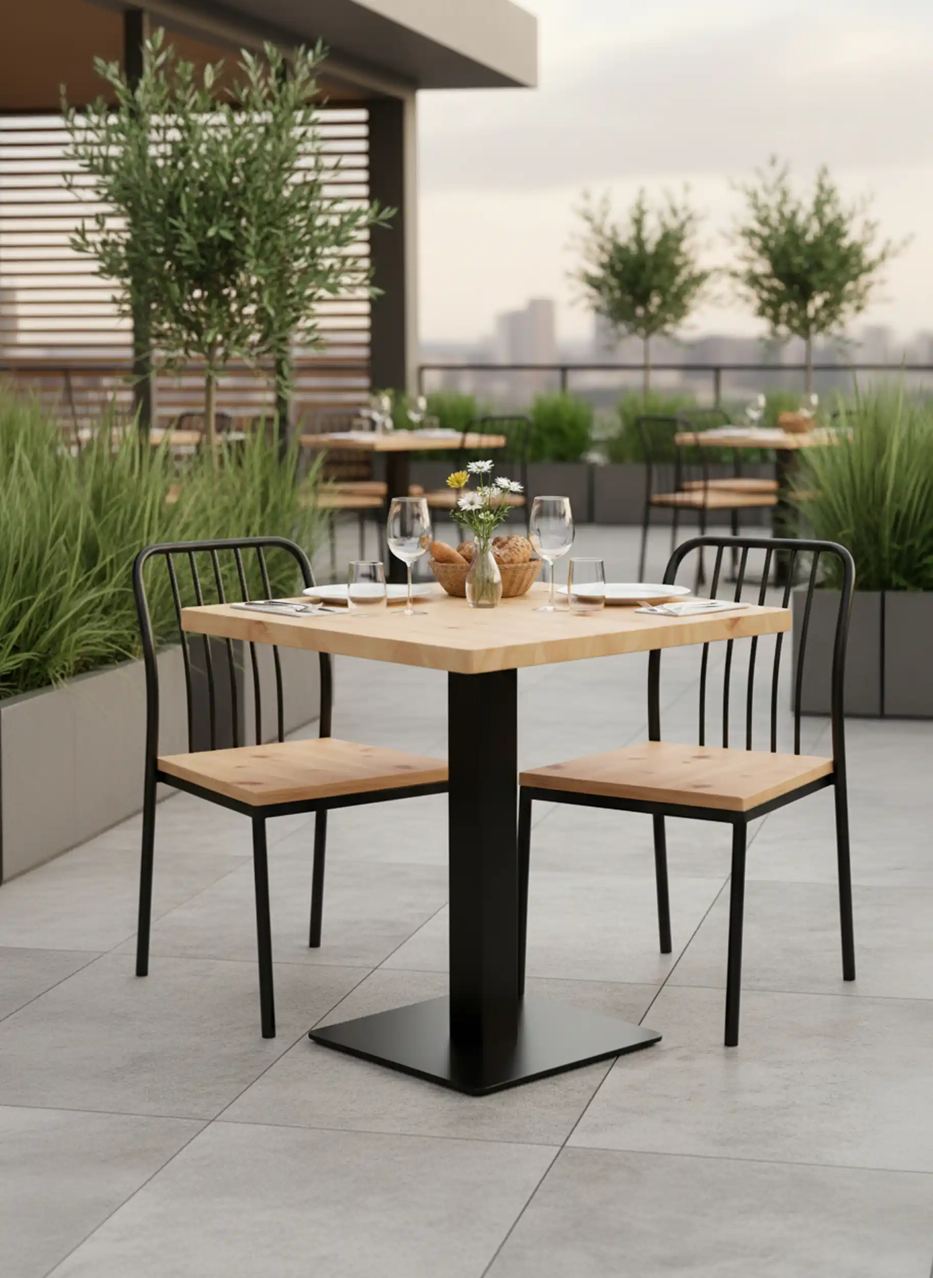 Disfruta el exterior con la calidez de la madera natural. Hay algo especial en compartir una comida al aire libre. Con nuestra mesa cuadrada Nexo OUT está pensada para esos momentos: desayunos al sol, cenas en terraza o el ritmo constante de una cafetería con encanto. Combina la resistencia que exige el exterior con la calidez estética que hace que un espacio se sienta acogedor. Es una mesa que no solo se ve bien, sino que responde al uso real del día a día.