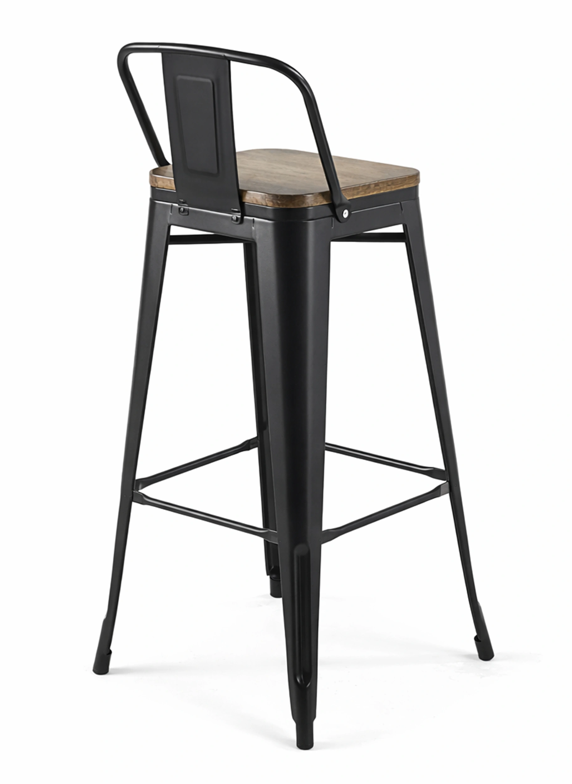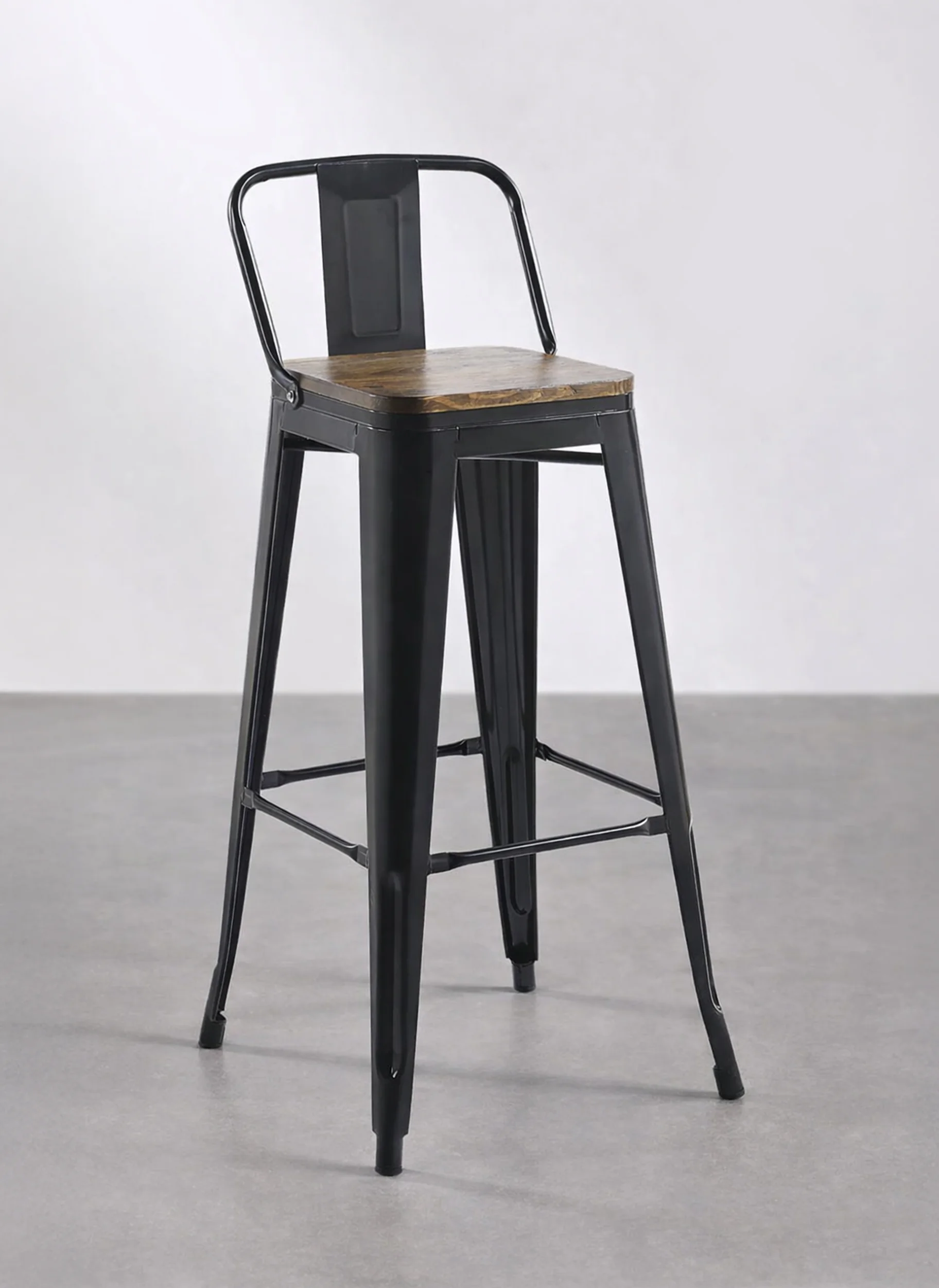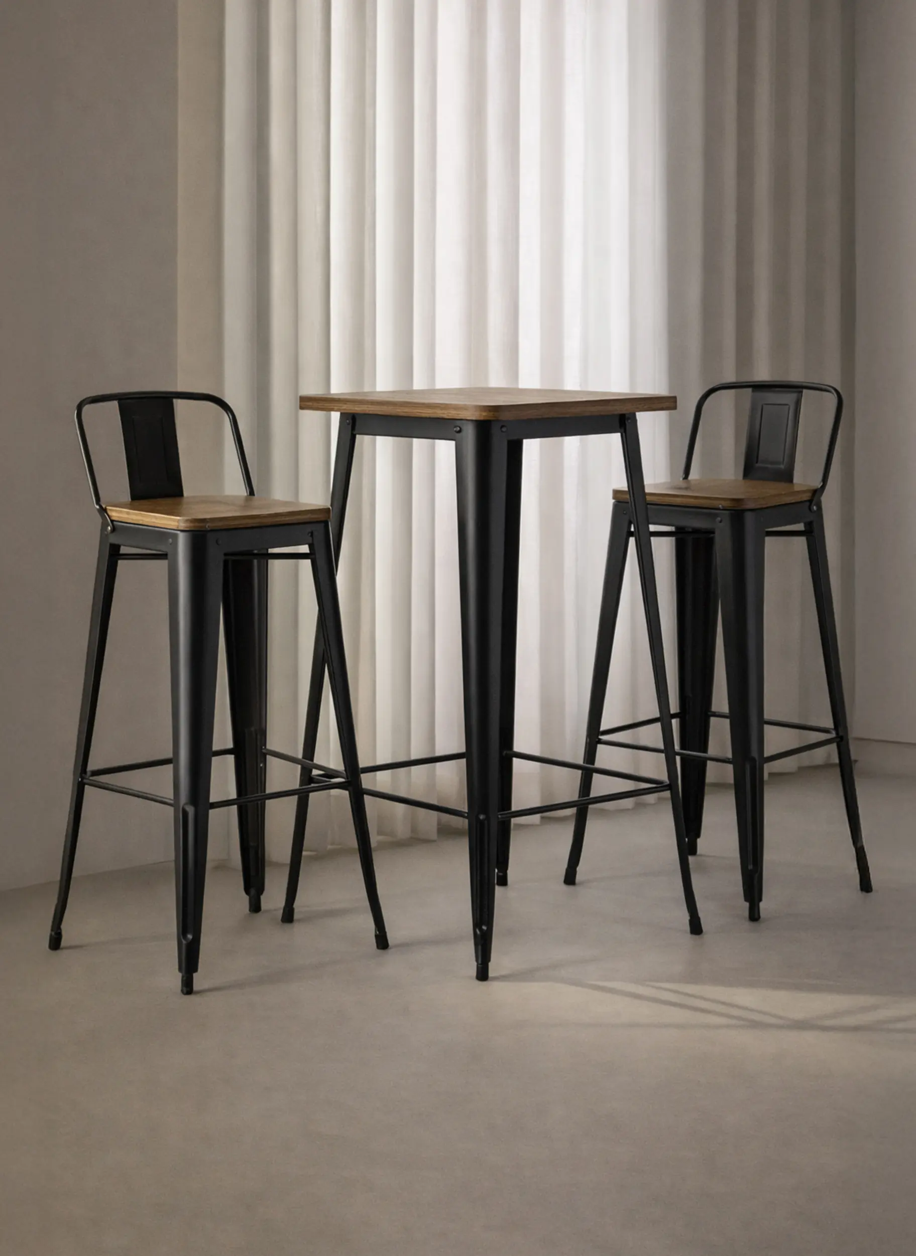 El diseño industrial de este taburete alto de interior combina la fuerza visual del metal con la calidez natural de la madera, creando un equilibrio perfecto entre funcionalidad y estilo atemporal. La estructura está fabricada en hierro lacado en negro, lo que garantiza estabilidad, resistencia y una larga vida útil incluso en entornos de uso intensivo. El asiento de madera en tono roble oscuro aporta un contraste cálido que suaviza el conjunto y lo hace más acogedor. El respaldo metálico no es solo un detalle estético sino que ofrece un apoyo extra que mejora la postura y hace que sentarse sea mucho más cómodo que en los taburetes sin respaldo, especialmente cuando la sobremesa se alarga.