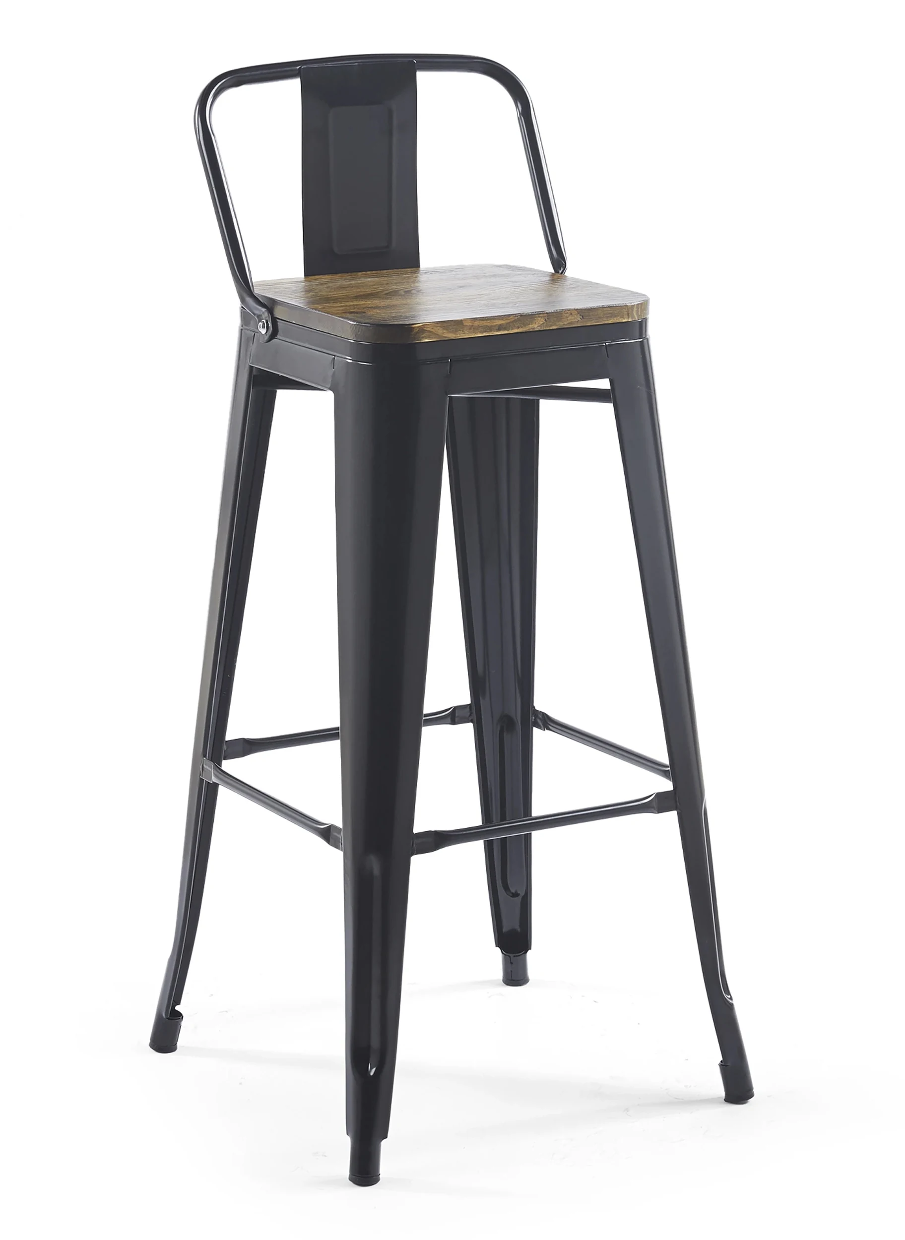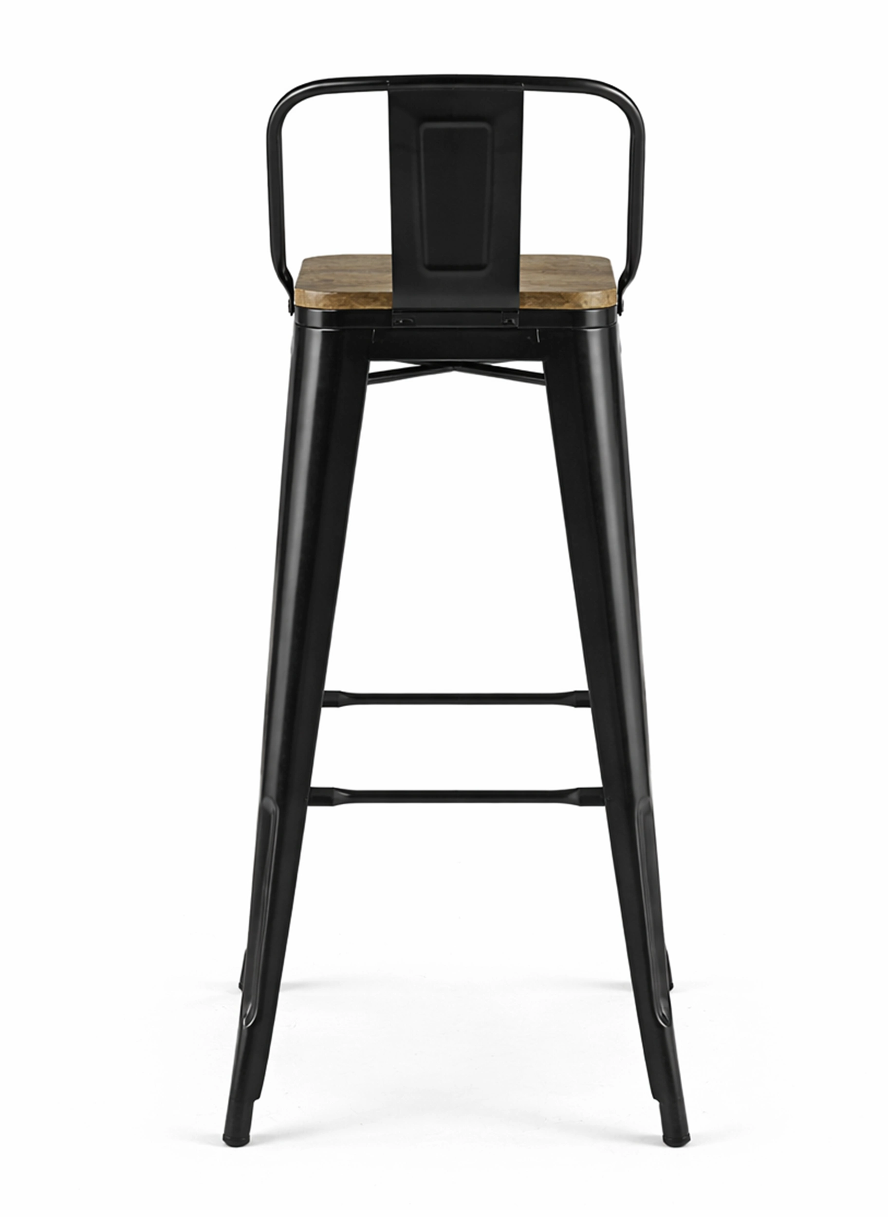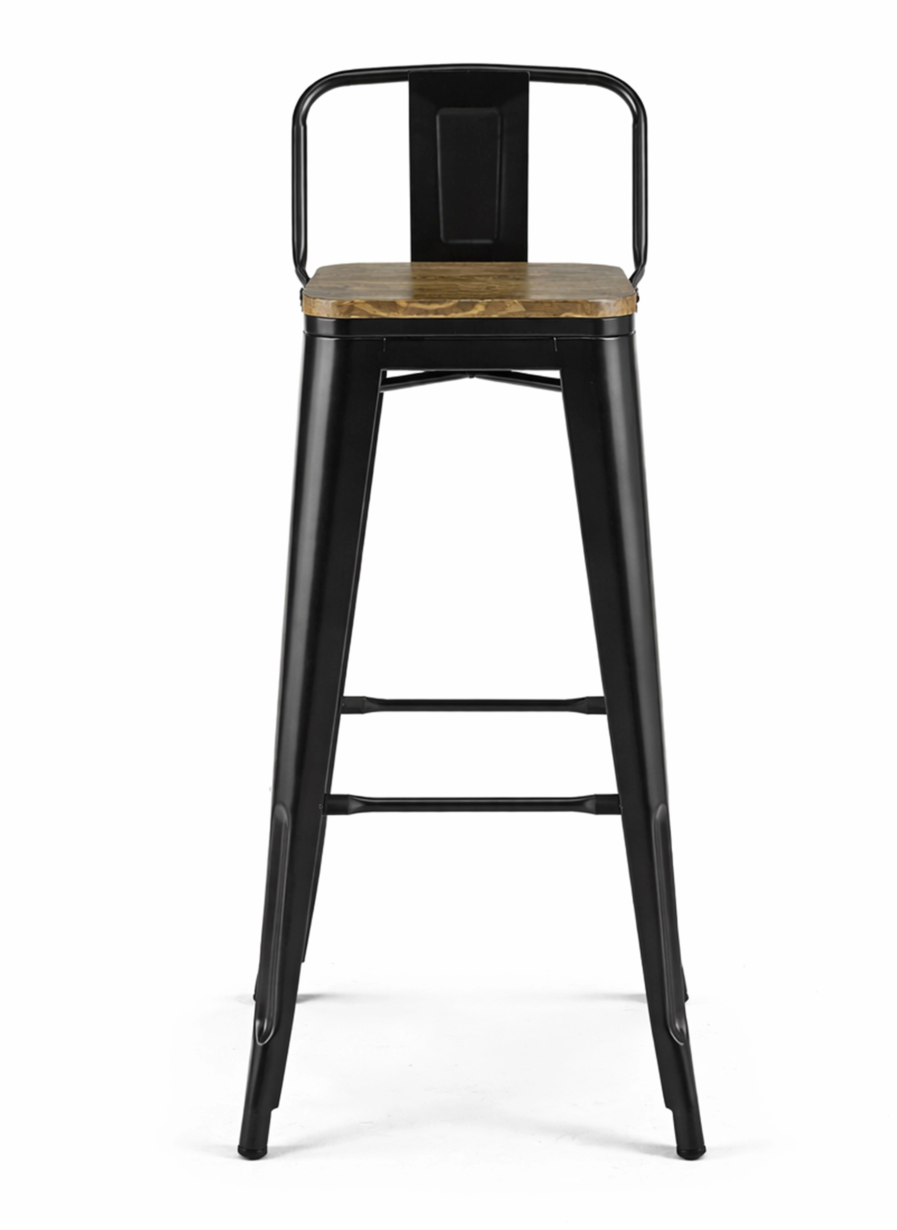 El diseño industrial de este taburete alto de interior combina la fuerza visual del metal con la calidez natural de la madera, creando un equilibrio perfecto entre funcionalidad y estilo atemporal. La estructura está fabricada en hierro lacado en negro, lo que garantiza estabilidad, resistencia y una larga vida útil incluso en entornos de uso intensivo. El asiento de madera en tono roble oscuro aporta un contraste cálido que suaviza el conjunto y lo hace más acogedor. El respaldo metálico no es solo un detalle estético sino que ofrece un apoyo extra que mejora la postura y hace que sentarse sea mucho más cómodo que en los taburetes sin respaldo, especialmente cuando la sobremesa se alarga.